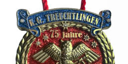 Der aktuelle Faschings-Orden der KG Treuchtlingen hat einen ernsten Hintergrund: die Corona-Pandemie. Geformt ist die ansonsten runde Medaille daher wie das Corona-Virus, gehalten in den Farben Gold und Schwarz. Abgebildet ist darauf ein Harlekin, der die Stadtfarben von Treuchtlingen, also blau und gelb, trägt. Er ist mit einer Injektionsspritze zur Virusbekämpfung bewaffnet.